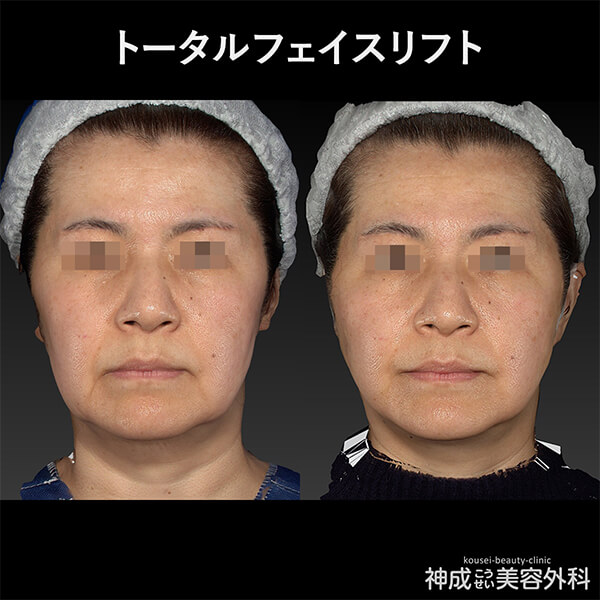 | 施術説明 | こめかみ~耳介前部~耳介後部を切開し、余分な皮膚及び余分な皮下にあるSMAS層を切除し先ずSMAS層を引き上げてから更に皮膚も引き上げ、頬や口元・フェイスラインをはじめとした顔全体のたるみを改善する方法です。 |
