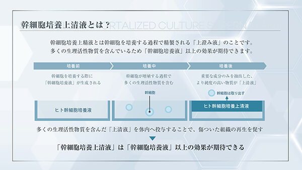 その際に、脂肪幹細胞が生産・分泌する成長因子群(分かり易く表現すると栄養素・エキス)を、脂肪幹細胞培養上清として治療に使用して来ました。