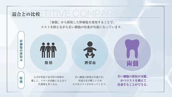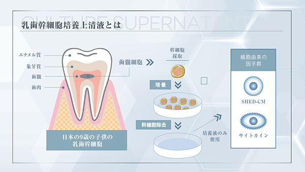 10歳未満の女児の抜け落ちた乳歯を再利用して、乳歯の歯髄幹細胞を分離・培養・増殖し歯髄幹細胞が生産・分泌する成長因子群を、歯髄幹細胞培養上清として治療に使用します。