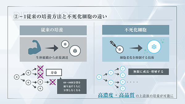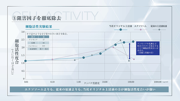 元の脂肪幹細胞の状態によって生産・分泌される成長因子群の量・質に差があり、若年者の脂肪幹細胞の方が中高年者の脂肪幹細胞よりはるかに多量の高品質な成長因子群を生産・分泌します。